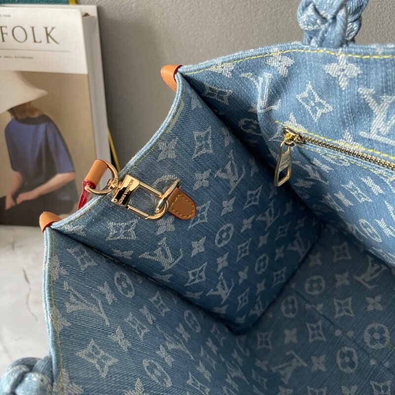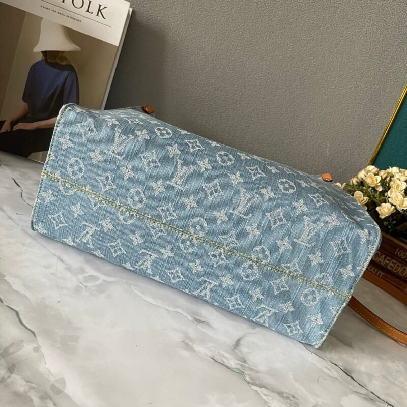 Blue Denim Checkerboard, Denim Quad Collection Onthego This Onthego handbag is refreshed with sand-washed Monogram jacquard tannins, with leather trimming and contrasting stitches. For business or leisure needs, the exquisite handle and long shoulder strap unlock a variety of carrying methods. Dimensions 35.0 x 27.0 x 14.0 cm