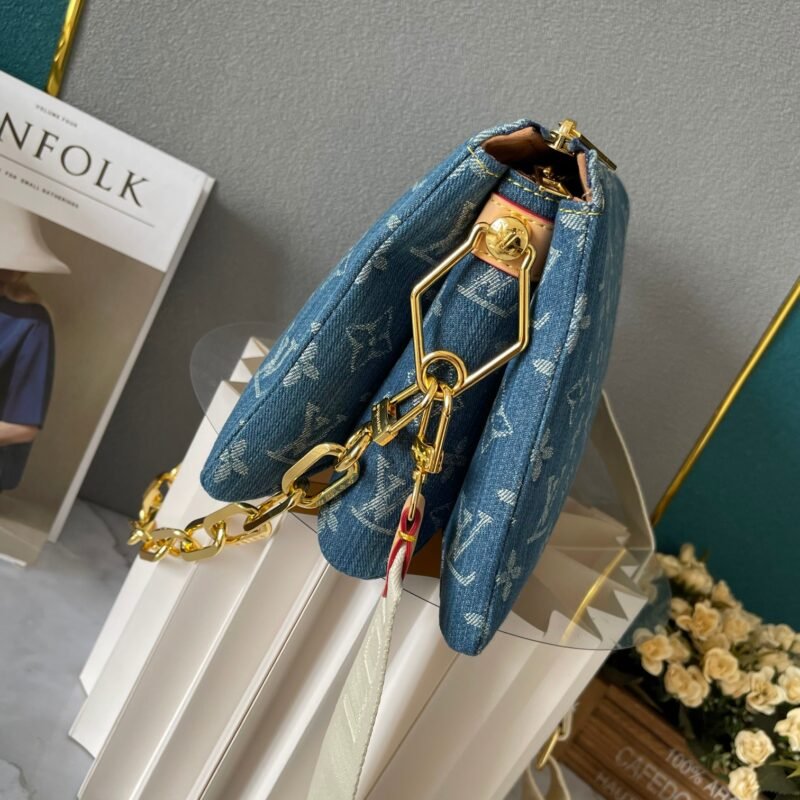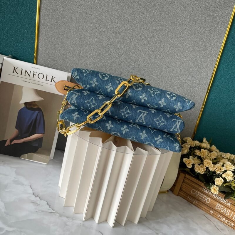 Upgraded version. M57790 M24564. This small Coussin handbag features a fresh and elegant vibe with the new season’s cotton denim. It achieves a unique look through bleaching and sand washing processes. Equipped with a detachable thick chain with engraved logo and a wide fabric shoulder strap, the lightweight carrying experience is once again upgraded. Size: 26 x 20 x 12cm.