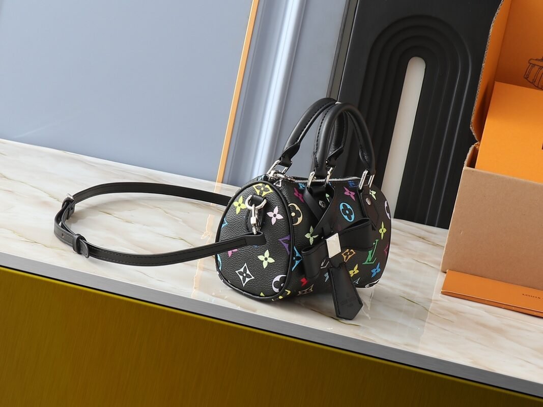 Upgrade the original M13391 M13406 M81085 LV x Takashi Murakami Nanospeedy bag. This Nano Speedy bag combines Monogram canvas with leather trim prints, featuring 33 vibrant colors in white, black, and red tri-colors. It has become a global hit, beloved by celebrities and influencers. Dimensions: 16x10x7.5 cm.