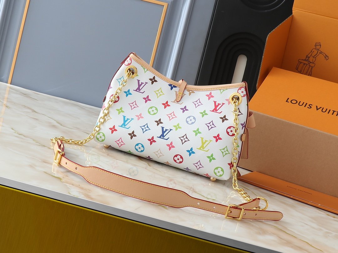 The upgraded M13014 M24860 CarryAll BB bag is crafted from Monogram canvas, featuring Monogram flowers embellished with eye-catching chains, perfect for both day and night occasions. The leather plaque and tie closure complement each other beautifully, while the zippered interior pocket makes it convenient to access credit cards. Dimensions: 26.0 x 17.0 x 10.0 cm