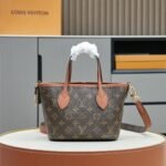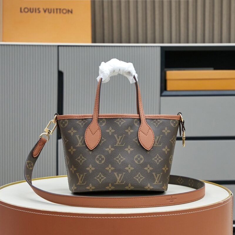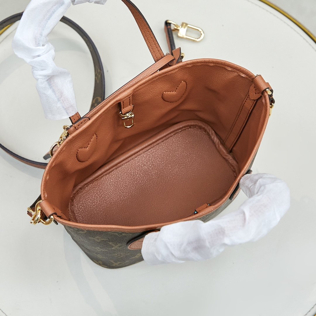 The double-sided shopping bag collection Neverfull Bandoulière Inside Out BB handbag, the iconic Neverfull handbag is reversible. The Bandoulière Inside Out BB edition is made from iconic Monogram canvas and has a grained leather on the back. It comes with a removable zippered bag that can be used alone or attached as an external pocket. Sparkling gold hardware adds that final touch. It also features removable straps that allow for crossbody. Dimensions: 24 x 14 x 9 cm