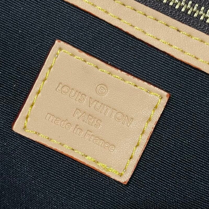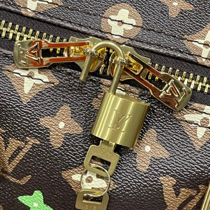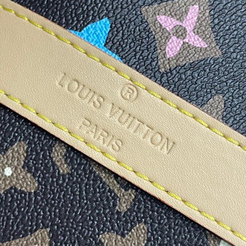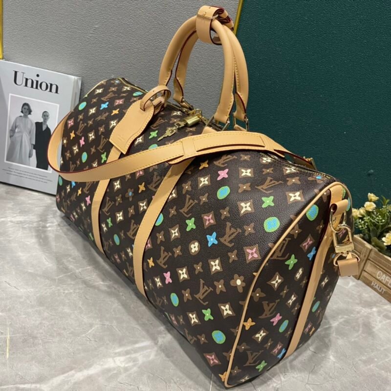This Lv X YK Keepall 50 combines classic design with iconic details. Made of Damier Graphite canvas, it is in the size of carry-on luggage. It features round leather handles and adjustable and detachable shoulder straps. The shoulder pad on the shoulder strap makes it more comfortable to carry. The detachable handbag can be used as a clutch or pocket. Size: 50x27x20cm.