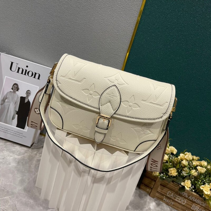 Handbag. This DIANE handbag is equipped with a leather shoulder strap (can be carried under the armpit) and an embroidered shoulder strap (can be carried on the shoulder or crossbody). Both can be removed. The capacity is sufficient for daily use. There is no pressure to hold the largest mobile phone. The belt-like buckle is a decoration. In fact, it is a magnet opening and closing, which is relatively convenient. There is a compartment in the middle for easy organization of things. There is also a zipper area where valuable items can be placed. Size: 25.0 × 9.0 × 15.0 CM.
