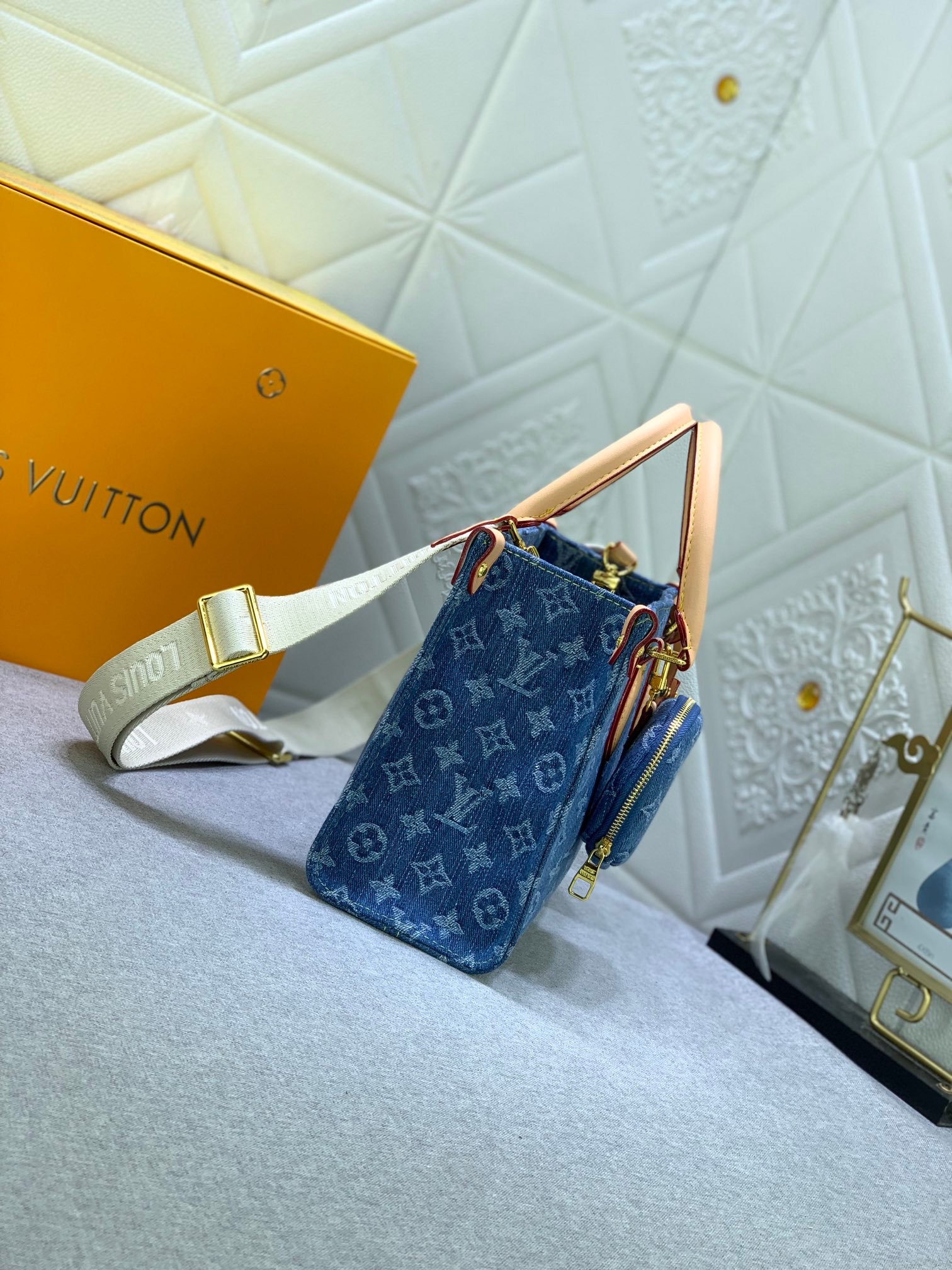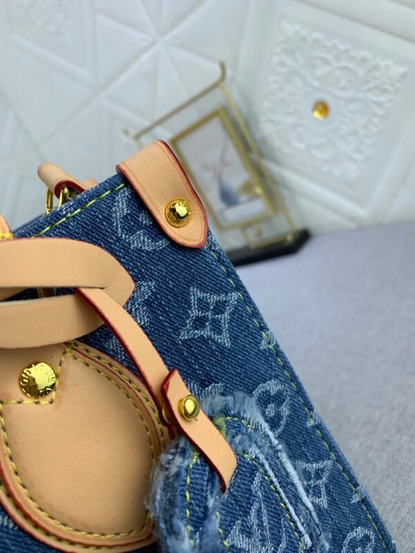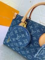 This denim jacquard OnTheGo PM handbag combines Monogram and Monogram Reverse canvas, and is embellished with Monogram Giant patterns. The Toron handle and the jacquard woven shoulder strap decorated with brand inscriptions create a visual contrast. The detachable coin purse is suitable for storing change or small delicate items. With both stylish charm and diverse functions, it becomes an excellent daily companion. 25.0 x 19.0 x 11.5 cm.