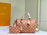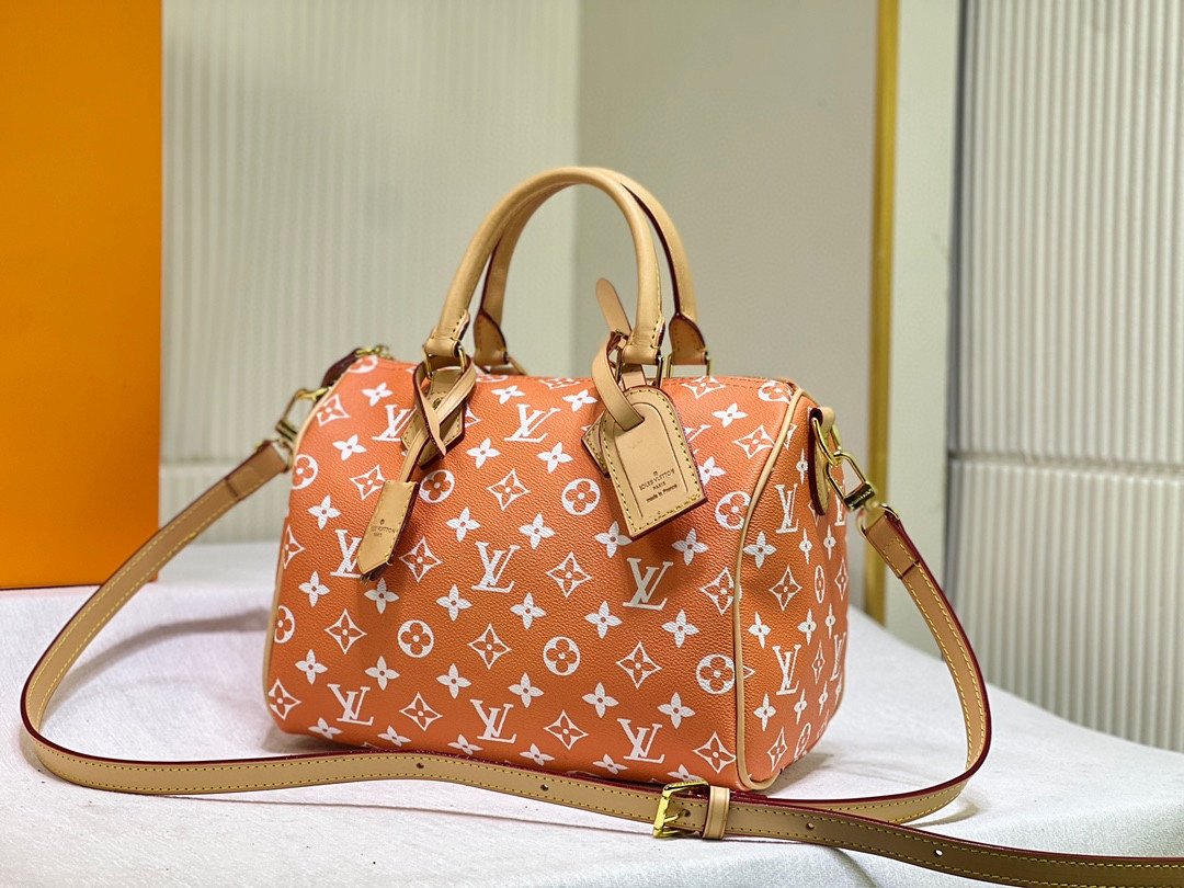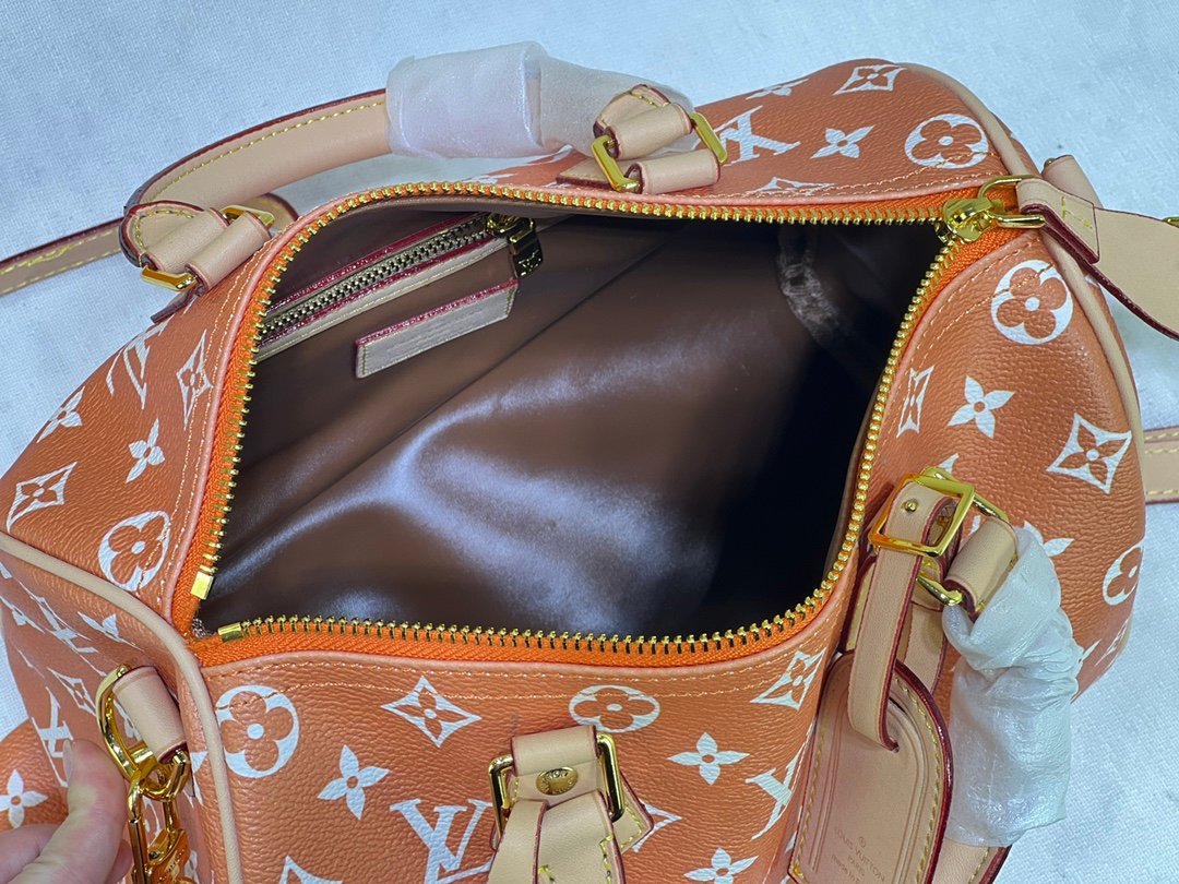 This Speedy P9 Bandoulière 25 Monogram Leather handbag is made of soft cowhide leather and reproduces the refined look of canvas printing with the Monogram pattern. Dazzling metal pieces, sheep leather lining and nameplates together confirm the unremitting pursuit of details by creative director Pharrell Williams. Size: 25x15x15cm.