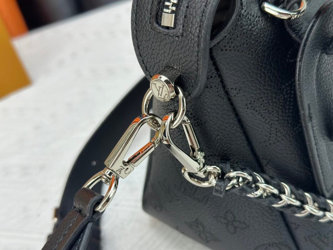 This Mahina Hand It All handbag is made of finely perforated cow leather to complement the chic contour of the bag with an elegant pendant texture. The leather shoulder strap and chain leather woven handle are removable, providing a trendy choice for everyday travel. Large 32.0 x 29.0 x 13.0 cm