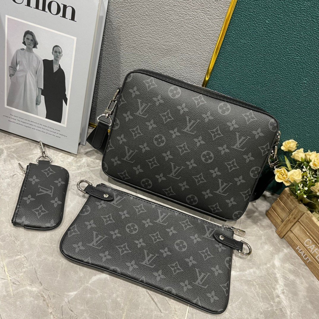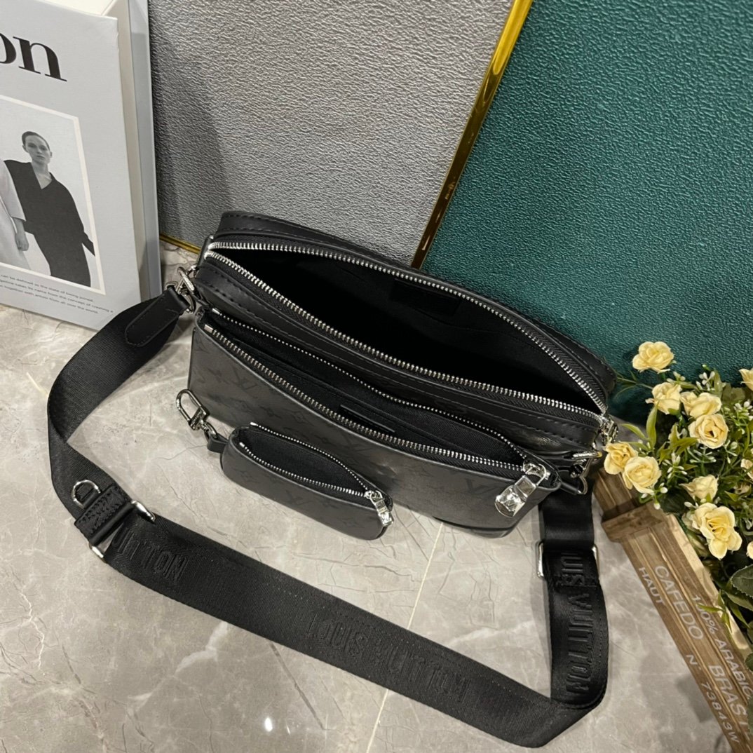 Upgraded M69443 M50017 M50027 M45320 M69827. The new Trio messenger bag is made of Monogram Eclipse canvas and Monogram Eclipse Reverse canvas. The iconic tonal grey pattern highlights the lines of this multifunctional patchwork design. In addition to the functions of a traditional crossbody bag, it is also equipped with a detachable zipper bag and a coin purse attached to the bag strap. Size: 25.0 x 18.5 x 7.0 cm.