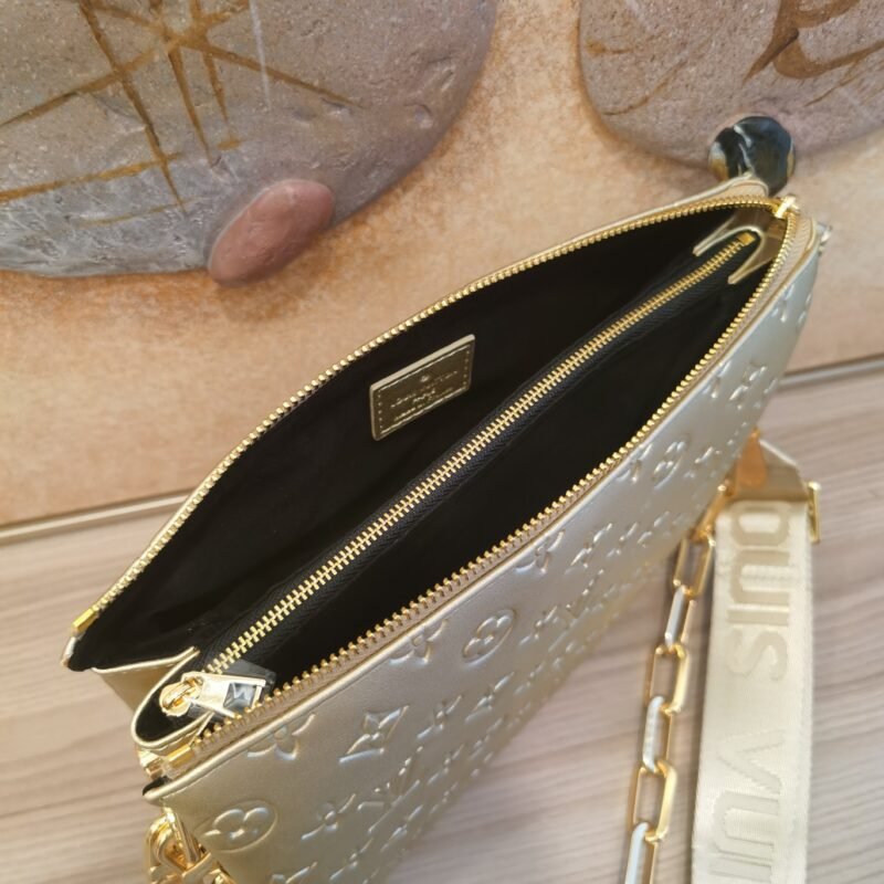 The top-of-the-line original M57793 57790 apricot Coussin small handbag shines at the Spring/Summer 2021 fashion show. Monogram embossed fluffy sheepskin creates a pillow configuration that injects avant-garde style into the minimalist design. Can be carried under the arm with a strap crossbody or an avatar chain baguette bag. Dimensions: 26 x 20 x 12 cm
