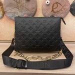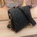 The top-of-the-line original M57793 57790 apricot Coussin small handbag shines at the Spring/Summer 2021 fashion show. Monogram embossed fluffy sheepskin creates a pillow configuration that injects avant-garde style into the minimalist design. Can be carried under the arm with a strap crossbody or an avatar chain baguette bag. Dimensions: 26 x 20 x 12 cm