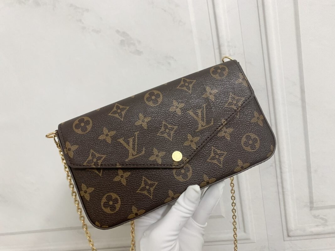 Three-piece set. Model M61276 Felicie handbag is elegant and luxurious. It contains two detachable pockets. It is a fashionable choice for carrying and organizing your everyday items. It is more than just a wallet. After removing the gold chain, it can also be used as a charming handbag or a small handbag. Size 21 * 11 * 2cm